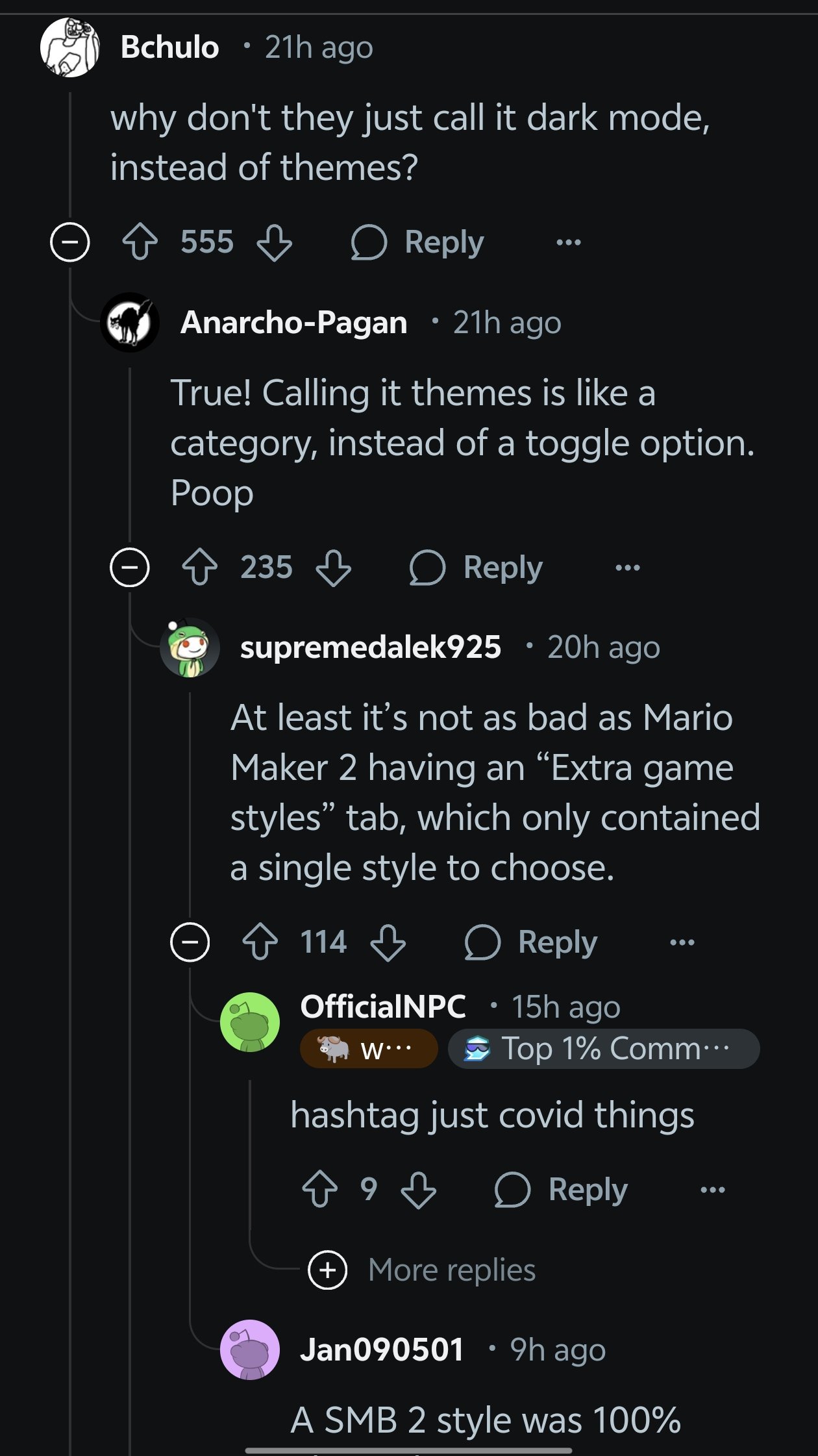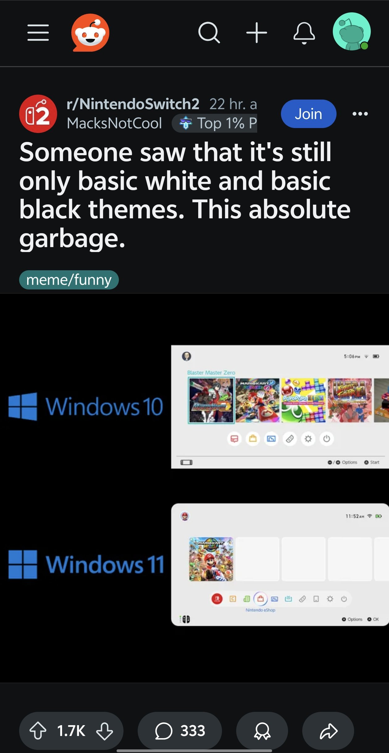 有不少國外網友安慰自己,說這只是上市前測試用的 UI 而已,甚至有些人提到,任天堂如果不提供主題背景更換功能,就不應該有“主題”更換的選項。玩家打開後發現只有深色和淺色兩種可以選擇,甚至嘲諷這種變化就像是 Windows 10 升級成 Windows 11。