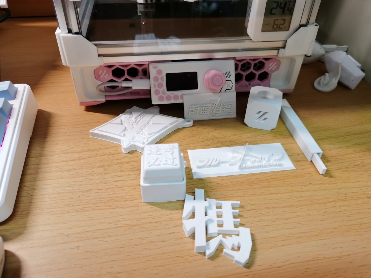 这是最近打印的一些成品,整体的精细度还是不错的,在一些很小的地方依然存在拉丝,首层喷嘴不干净已经通过车床G代码解决。