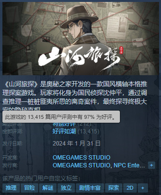 疫情前,剧本杀在国内非常火爆,培养了大量喜欢角色扮演和悬疑推理的玩家。他们在线下受限后,对PC上的推理游戏产生了兴趣。《山河旅探》的火爆可能就受益于这部分用户。