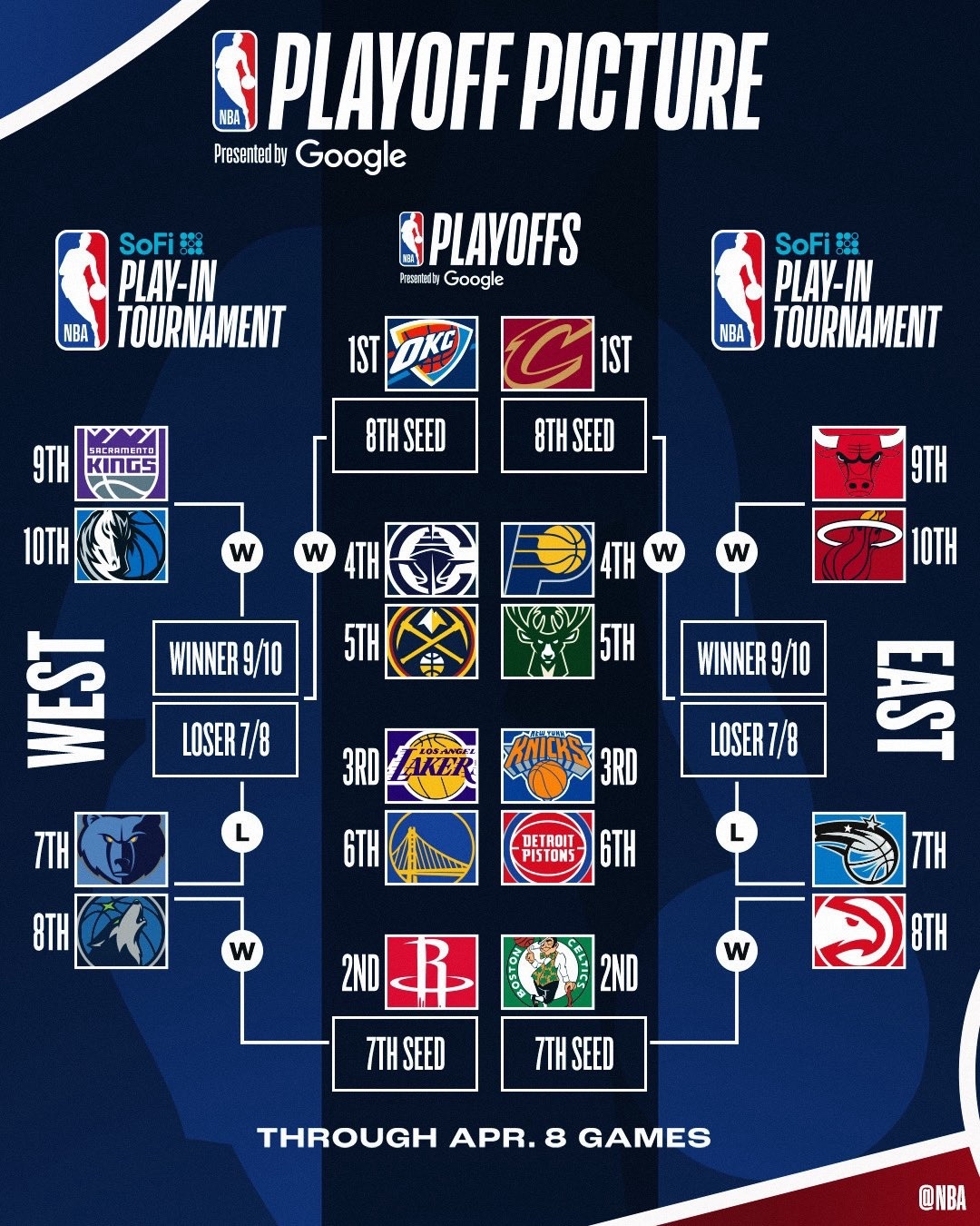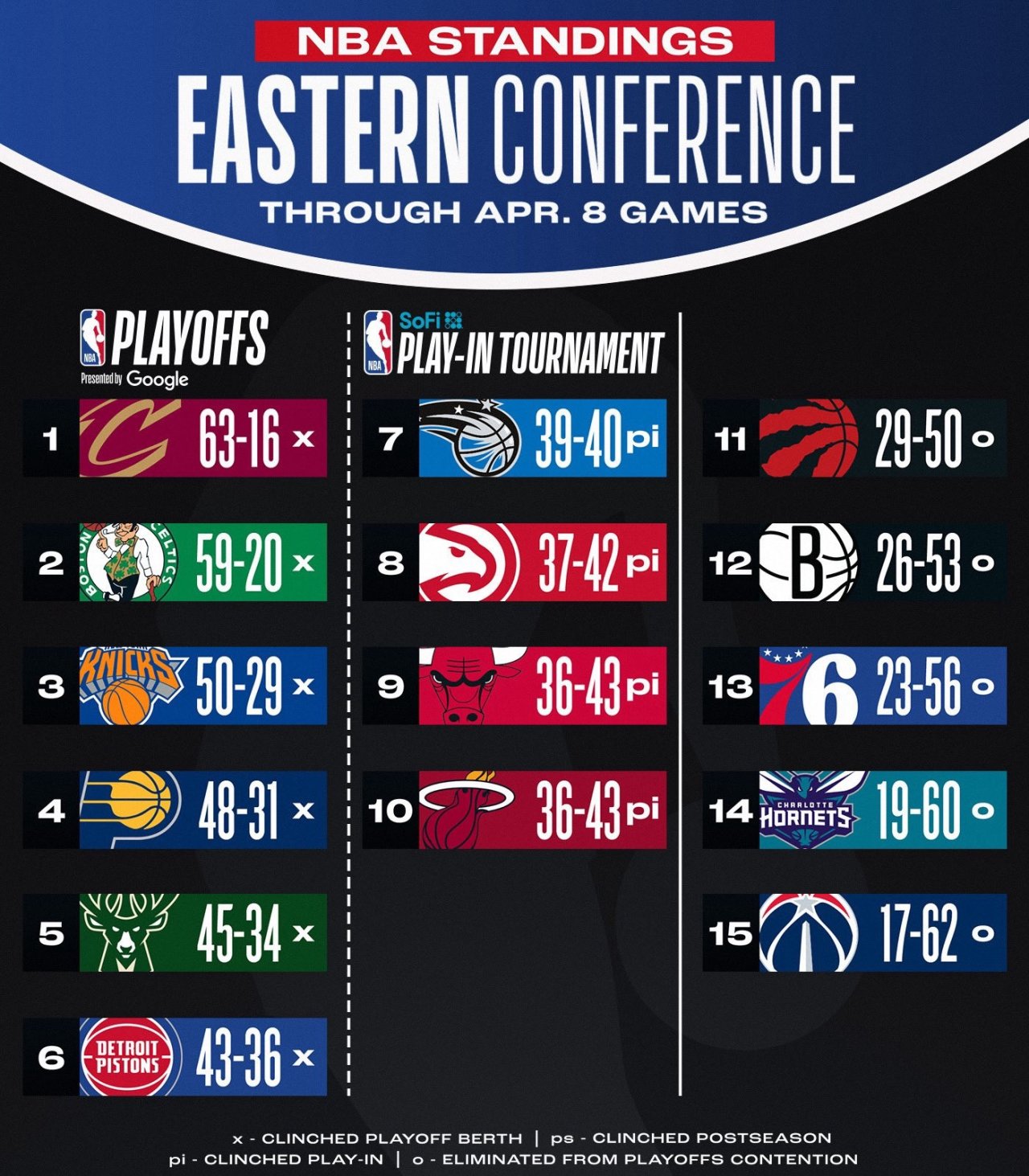 東部季後賽首輪:第1的騎士對陣8號種子,第2的凱爾特人對陣7號種子,第3的尼克斯對陣第6的活塞,第4的步行者對陣第5的雄鹿