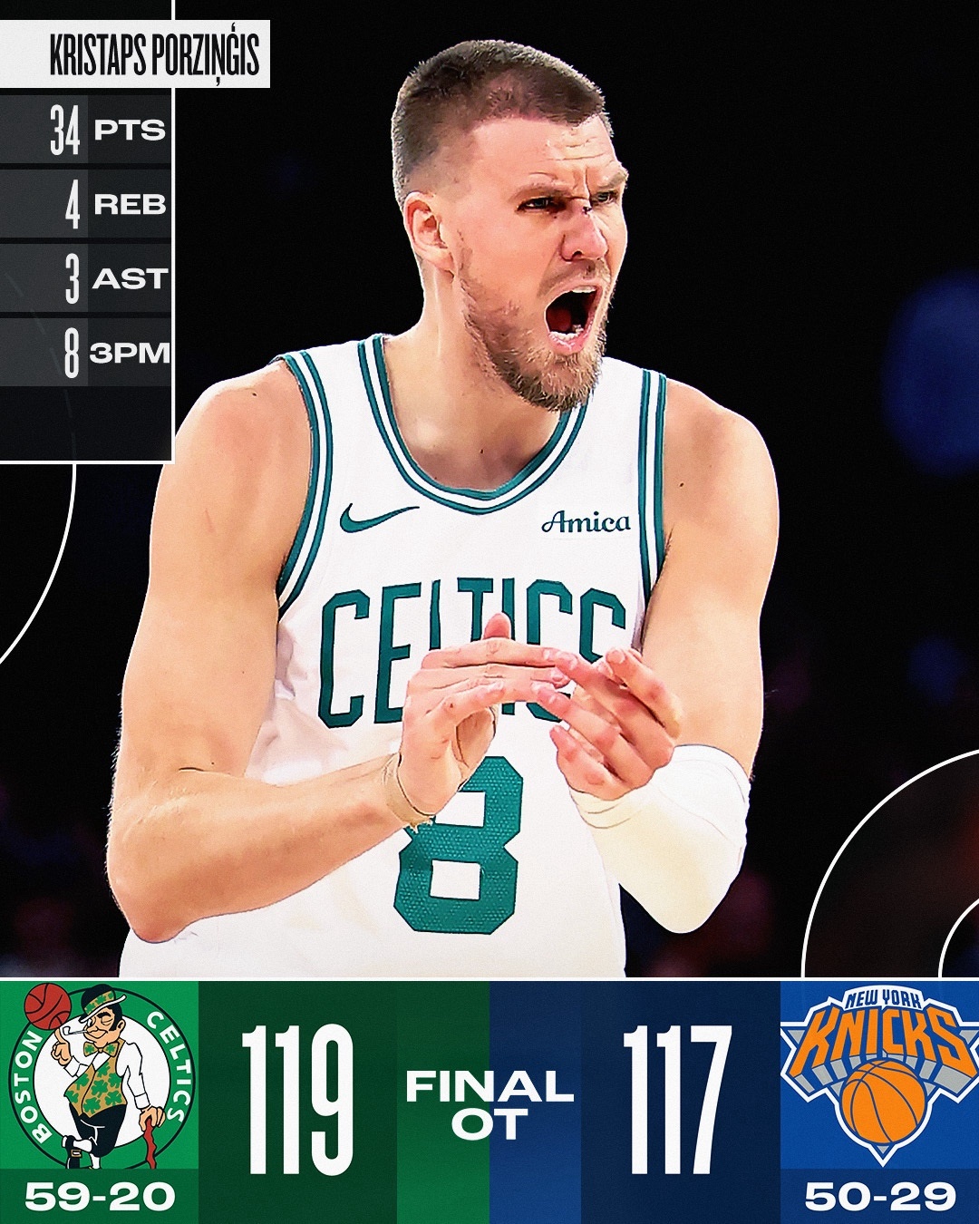 克里斯塔普斯·波爾津吉斯追平生涯三分紀錄並獻絕殺,助@波士頓凱爾特人 加時客場險勝!