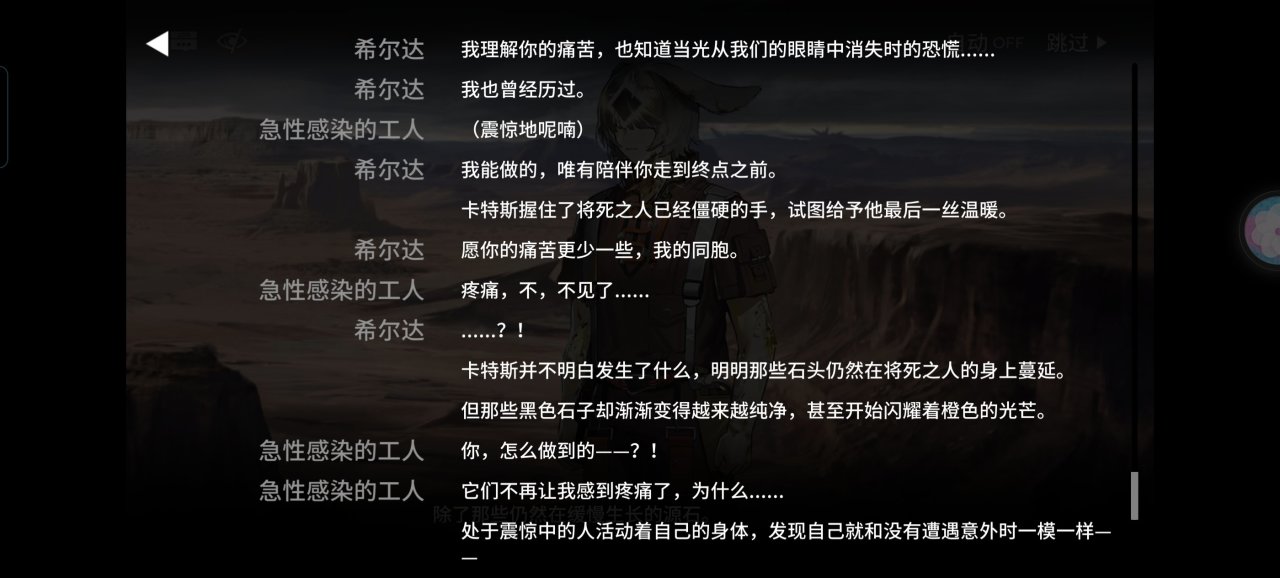 她在罗德岛不远处醒来,看到了一个即将崩解的矿石病患者,她握住了一个即将崩解的矿石病患者的手。随后这个患者[身体不再感到疼痛],源石结晶变得纯净,开始闪耀橙色的光。