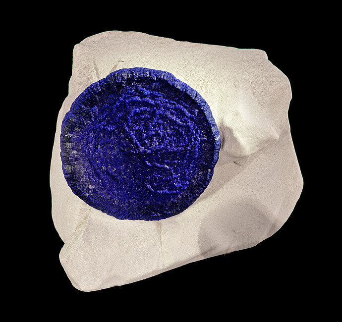 它們被稱作太陽花藍銅。這個名字是不是有點眼熟?還記得作者介紹的太陽花黃鐵波,與其不同的是,這些藍銅礦生長在當地的高嶺土之間,這些密集的高嶺土土層迫使它們以橫向壓縮、輻射的方式生長。