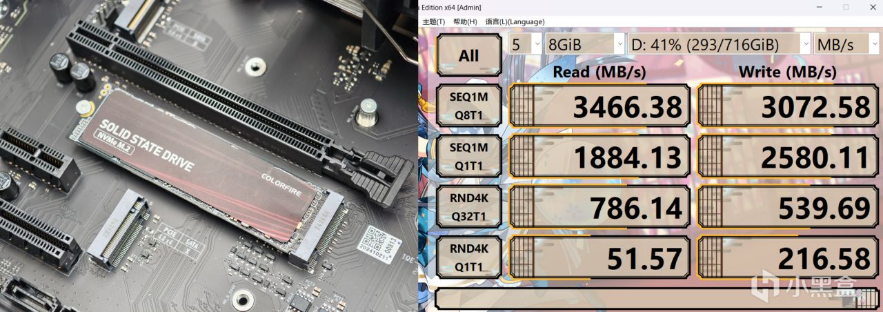 CDM测试中,在半盘(41%)状态下,能达到4.0应有的速度,8GB模式下顺序读写分别为3466MB/S和3072MB/S。并且4K小文件也有51MB/S和216MB/S。