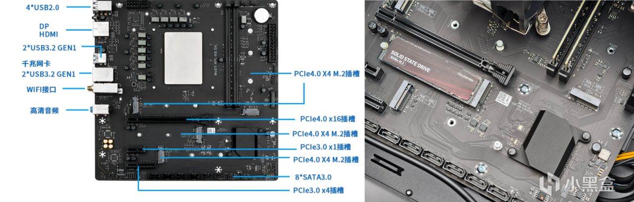 首先是其拥有四个PCIE4.0全尺寸M.2硬盘插槽,其次底部整齐排列8个SATA接口,简直是NAS神板好吧,搭配一个专用机箱,摇身一变高性能NAS主机,虚拟机用一个,闲置一个!