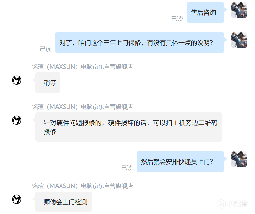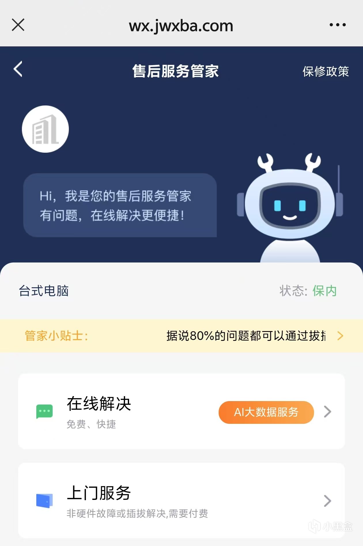 通过咨询得知,当电脑故障后,直接扫描机箱侧面的二维码进入保修平台,申请检修,软件问题可当场解决,硬件问题直接转交售后,京东上门服务。