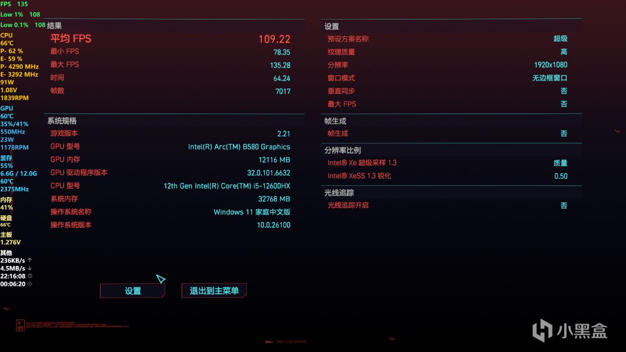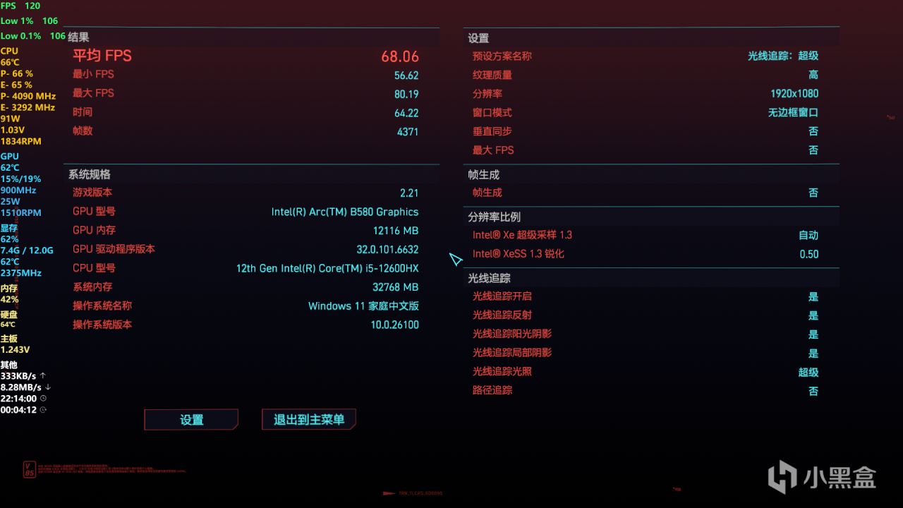 在较为有代表性的3A游戏《赛博朋克2077》中,1080P超级光追画质拉满的情况下,平均能达到68FPS,最低也有56FPS,且CPU功耗为80W左右。