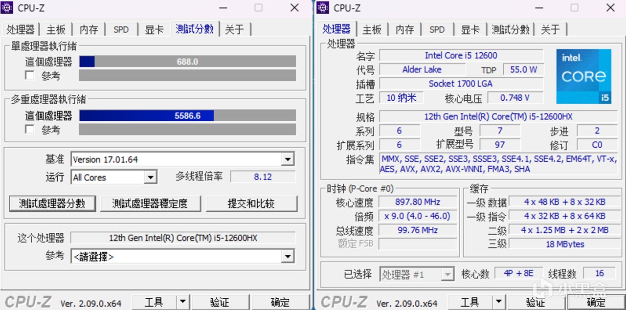 CPU为移动端的I7-12600HX,4P+8E共计16核心,规格整体看不算太差,再结合其相比笔记本平台更为激进的性能释放,实际表现还算可以。