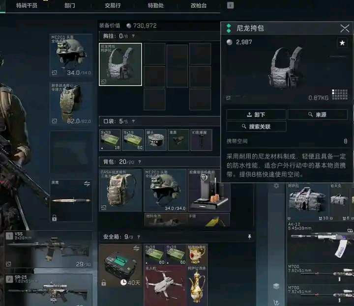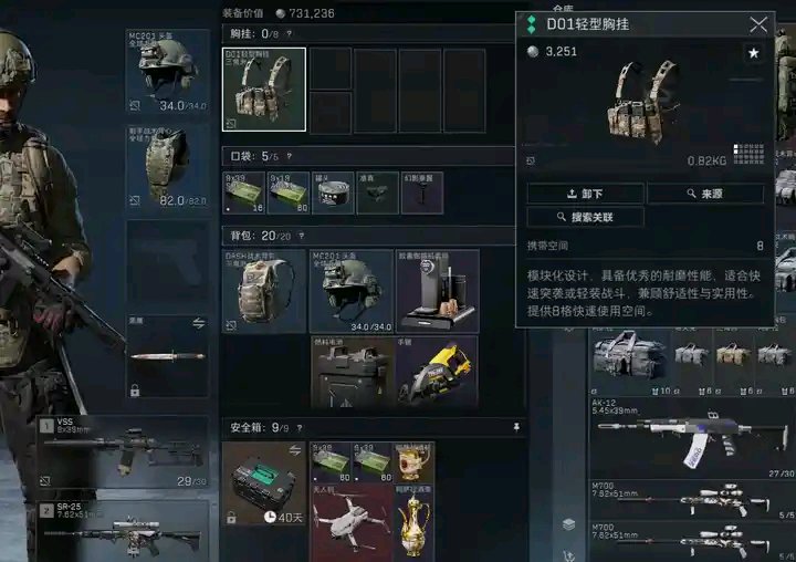 參考輕型戰術胸掛但記得觀光客系列任務有一個需要帶這個胸掛入局,各位做這個任務的時候不要傻傻的直接空手進去了!胸掛裏面的兩個格子是可以塞進去任意一把滿改手槍(推薦左輪 沙鷹 93r g18)協助完成任務的。