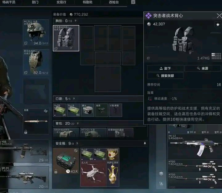 容量暴漲至16格而且第一次出現了四格的容量位置,所以能夠放下一個金色大血包或者是金色以上護甲修理包。但本身價格比起強襲戰術背心價格翻倍的同時還是有着影響戰鬥移動速度-百分之一的負面效果仍舊是不推薦購買,很多時候百分之一的移動速度就可以決定生死了。