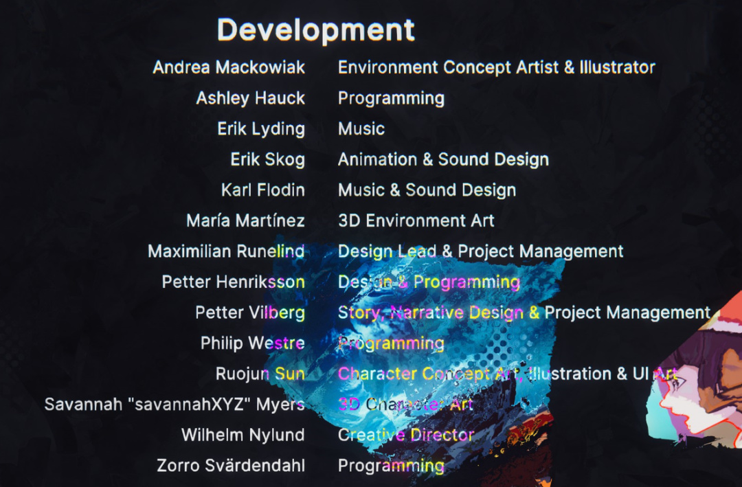 负责《Haste》研发的是一个相当国际化的独立团队,研发岗成员有14人,除瑞典外还分布在美国、西班牙、法国等地,远程工作的还挺多。除了老黑以外,有不少人也是在这个项目里第一次与Landfall合作的。她猜测公司想尝试做第一款「稍微正经一点的带剧情的」游戏,才四处寻找人才专门组建了一个新团队。