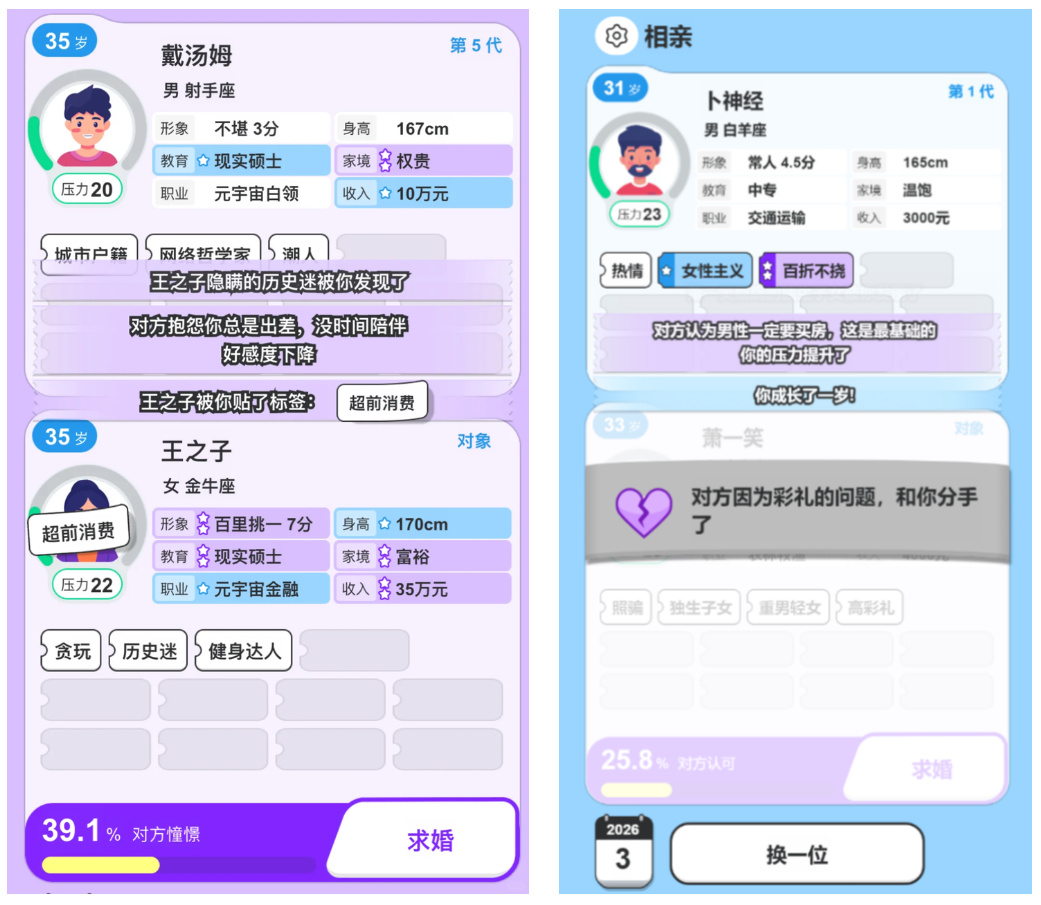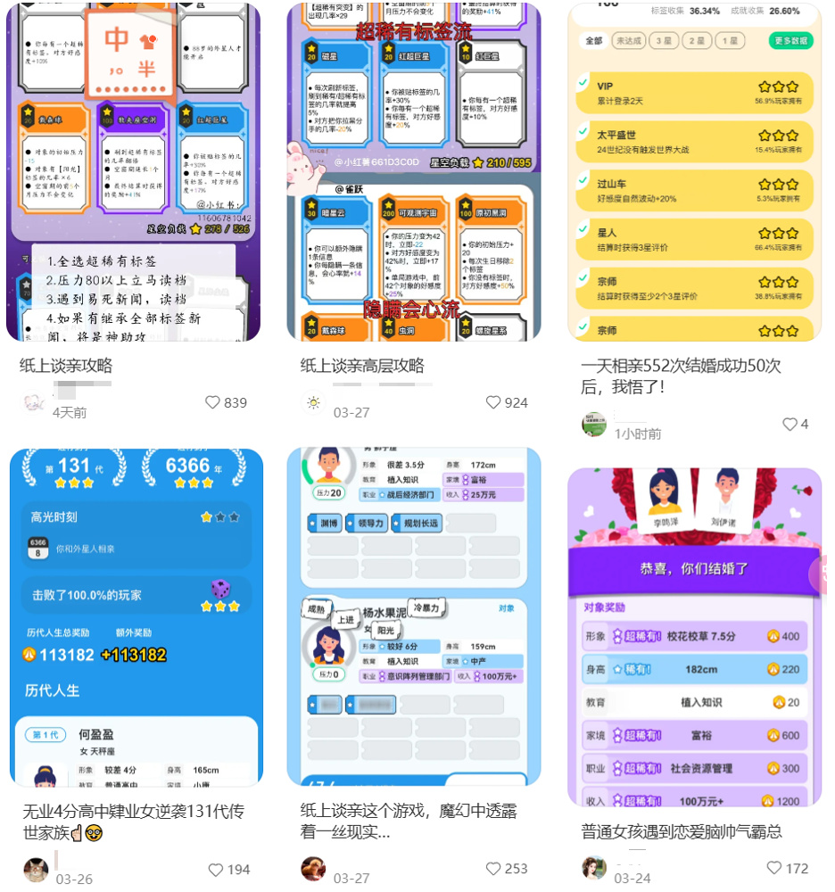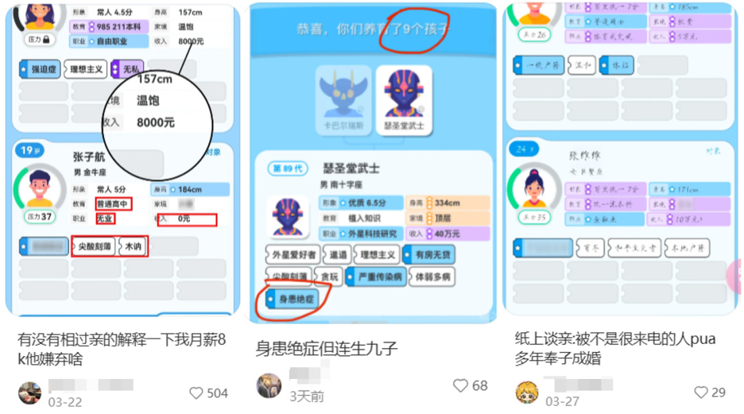 但这并不影响玩家的游玩体验,小红书上已经有不少玩家开始分享《 纸上谈亲 》的世界发展,挖掘其中有趣的点,分析为啥月薪 0 元的看不上月薪 8000 的,身患绝症的外星人为啥连生 9 子,以及谁谁谁是不是 Pua 了。