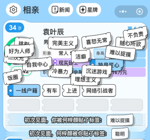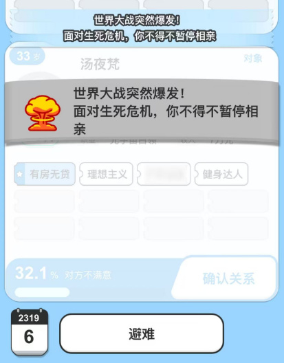 相处过程中,会发生一系列随机事件,如果你收入暴涨,相亲对象的好感度大都也会提高,如果你隐瞒的离异史/带孩相亲被对方发现,那么好感度也会随之下跌。