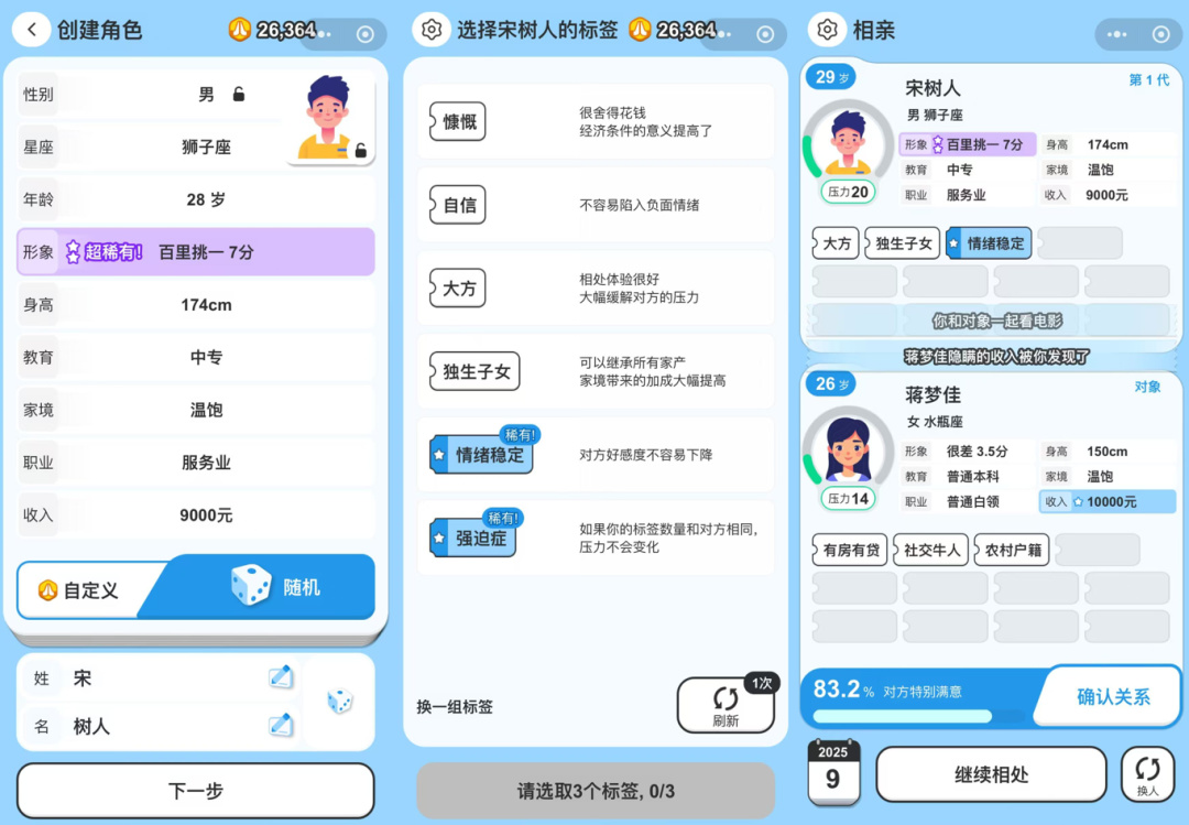 你扮演一位玩家,所有属性随机生成,进入相亲市场后,你得想办法追到心仪的对象,确认关系,求婚,生下一代,循环往复。