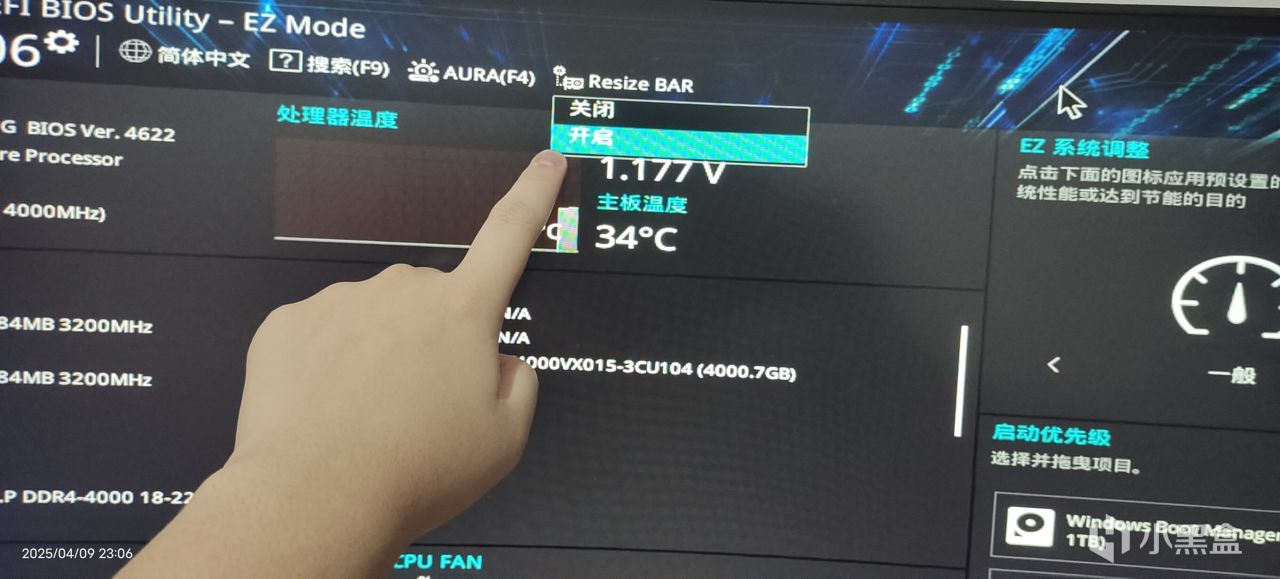 4.如果是3A平臺要開啓SAM技術,amdcpu+amd主板+amd顯卡,點擊ResizeBAR開啓即可