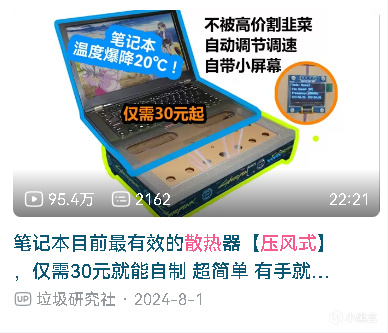 其實壓風式散熱器並不是什麼高技術含量的東西,而且材料成本極低,完全可以自己製作,B站UP主 垃圾研究社 就發過一個製作教學教程,成本僅需要30元即可,對於很多經濟能力暫時有限,但動手能力強悍的盒友而言是很好的方案!