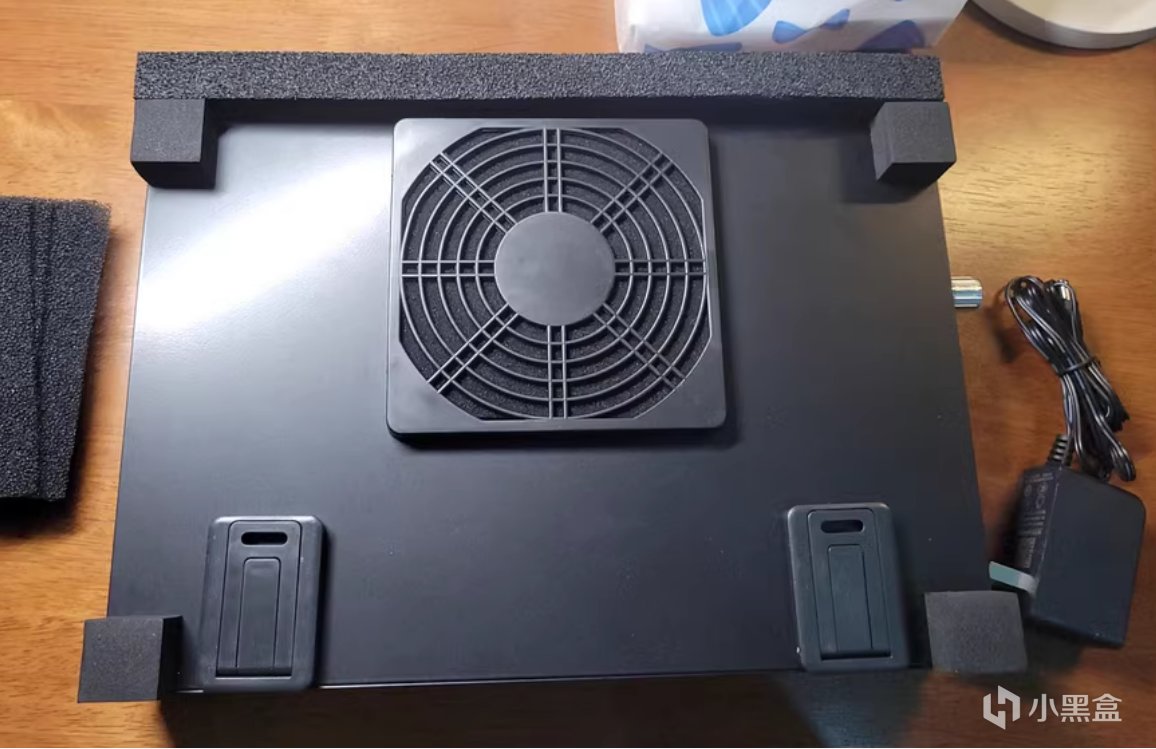 首先看看單風扇款,相比起飛智的炫酷多彩,風暴熊整個設計就是公版磨具,沒有什麼特色,方方正正。不過機身是黑色金屬板材,機身的用料倒是比飛智的塑料強,耐摔耐操。正面有四周圍繞了一圈海綿封帶,封帶比較寬,應該是爲了適應不同尺寸的電腦。表面有一個長條狀的出風孔。右側有一個銀白色的調節風速的旋鈕,同時也是一個電源開關,電源插口是非通用的圓型插孔,自帶了一個120w的電源插頭。