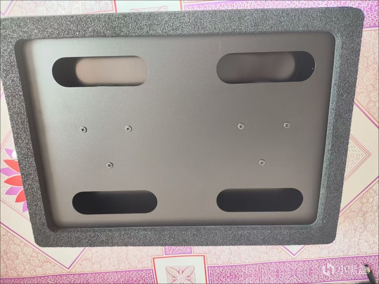 背面也是黑色金屬板材封裝,四個角使用了防震海綿作爲機身站腳,中部有一個可拆卸的防塵網(這個比飛智強),下方有一個可調節的抬高腳架,不過可調節擋位只有兩檔,分別是15度和30度。