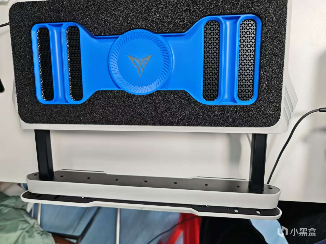 底部有個進風的大屁股,前底和後底均有橡膠防滑條。底部兩邊還有個可調節擡槓,用於撐起不同的高度。
