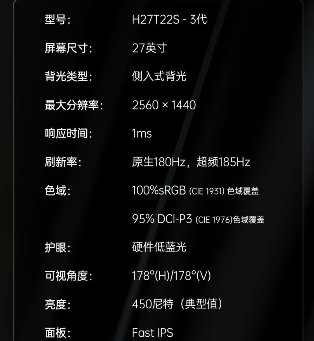 27英寸,2K分辨率,185Hz高刷新率,採用Fast ips屏幕,1ms,支持廣色域,100%的srgb,95%的p3,色準e值同樣<2,不管是遊戲還是辦公設計都能滿足要求。