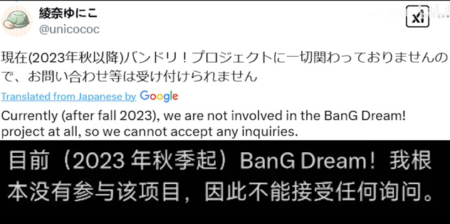 首先就是大伙公认的《MyGO》功臣同时也理应是《Mujica》剧本编写者的绫奈独角兽突然发文跟《Mujica》切割。