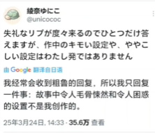 而随着剧情的发展,初华初音双子设定揭露,初华“意外”成了祥子小姨的时候,独角兽又绷不住了,再次在推上发言:作品中那些复杂恶心的设定并非出自我手。