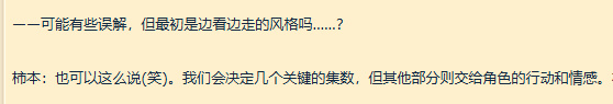 在第九集播出后的访谈中,他曾经提到自己对于剧本的开发风格是“废弃与重建”,最初只有一个草稿,后续详细的剧情与细节基本都是边走边看。