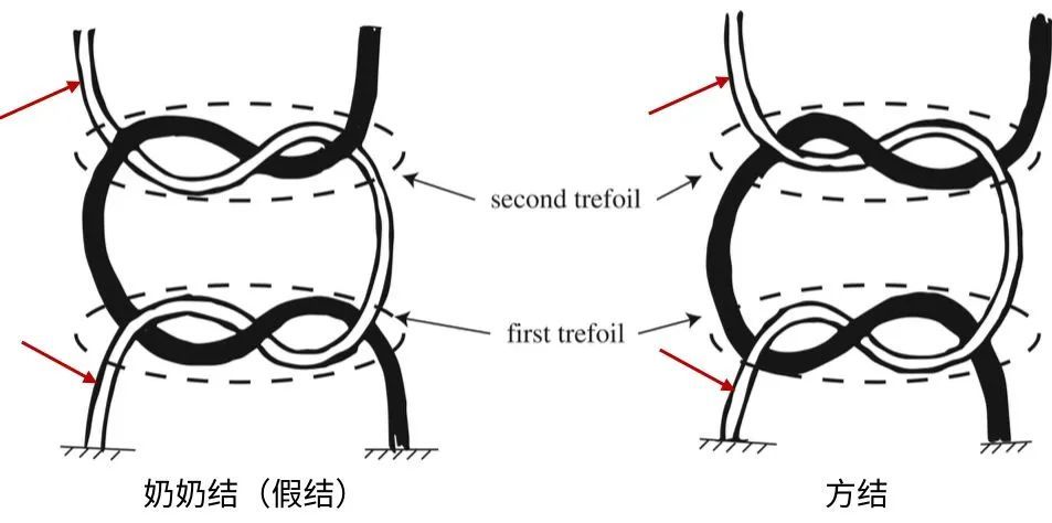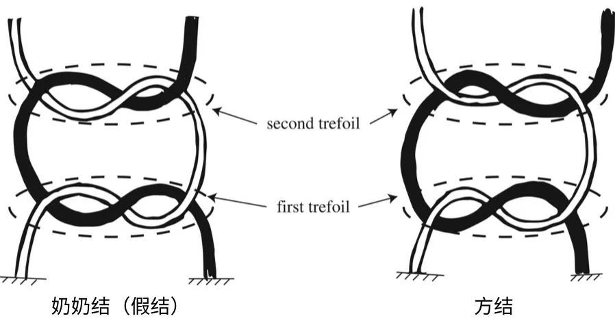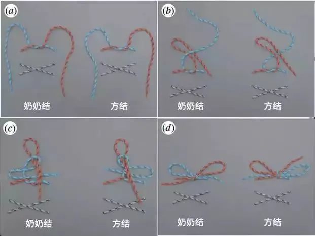 先来看奶奶结和方结的区别。如下图,奶奶结的第一个结和第二个结是同方向的,而方结则是相反的。也就是说,如果系第一个结时,右边的绳子在下,那么第二个结就应该让右边的绳子在上,这样才是方结。