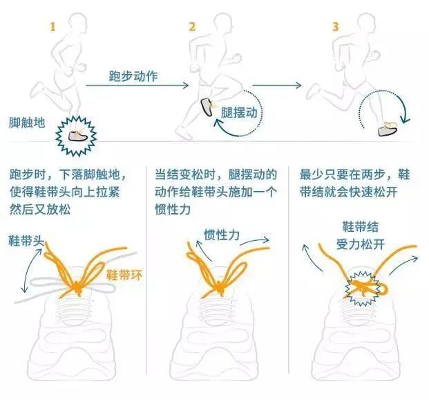 他们发现,在跑步过程中,脚着地(跺脚)时,鞋带会由于惯性向上拉紧然后又放松,这个过程导致你每跑一步,鞋带结都在慢慢松开!而摆动腿会使鞋带头来回甩,并把鞋带往外拉。
