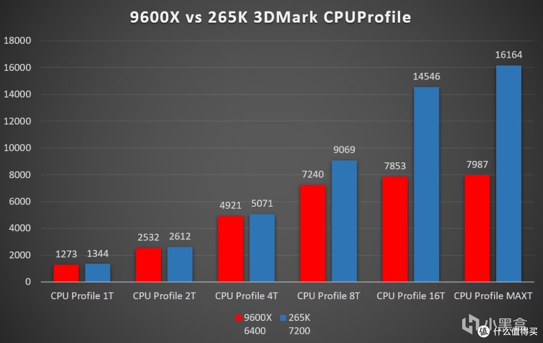 需要明确的是,9600X和265K并不是一个价位段的,9600X即使盒装也才1300块,但是265KF的价格少说也要2000块。直接就差700块钱。
