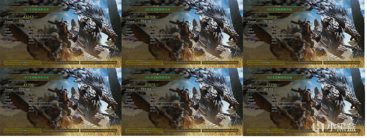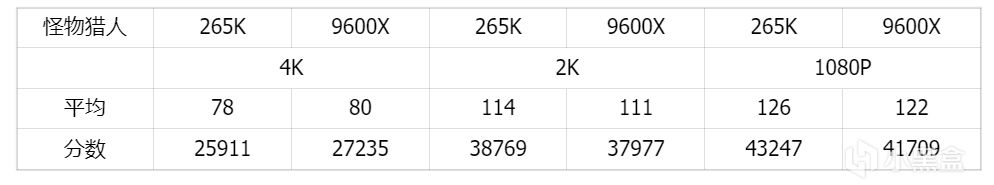 在《怪物猎人:荒野》2K分辨率下,265K与1080P分辨率下一样,整体差别不大,两颗CPU拉不开差距。