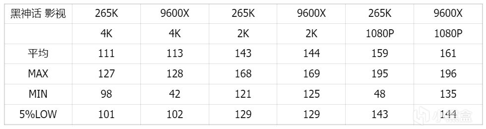 相比之下,像《黑神话:悟空》这类单机游戏,对CPU的单核性能要求更高。在4K下相差无几,除了9600X可能最低帧不太好,但是5%LOW帧两个都是100帧,能在一定程度上保证体验。