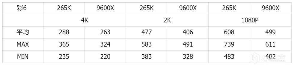 彩虹六号作为育碧网游,优化还是很不错的。265K依靠多两个大核在4K分辨率下,《彩虹六号》搭配265K的表现会更好,不过两者帧数相差仅20帧。虽说在最低和最高帧数上,265K都领先较大,但整体仍处于同一水平。