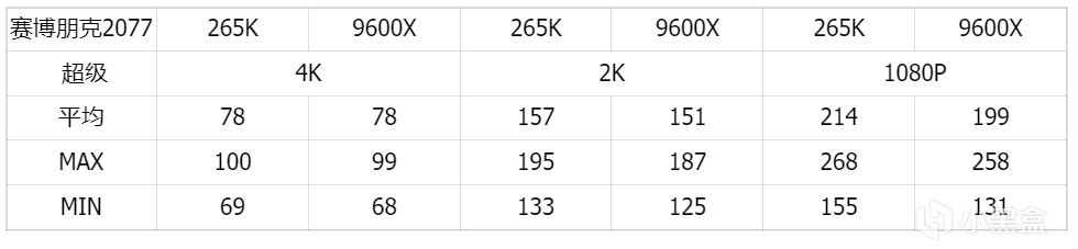 在2077这个优化现在还没完全做好的游戏里,4K 2K平均帧数没有区别,更多在1080P方面265K领先一点。这个领先更多是265K在最低帧数上有更稳定的表现。