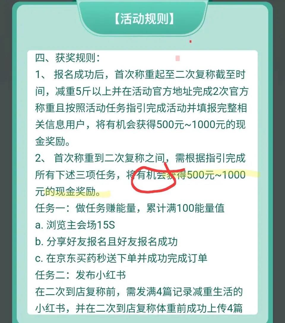 减重≥5斤后,每斤奖励100元,上限1000元。例如,减重10斤可获得1000元,而减重5斤则为500元。