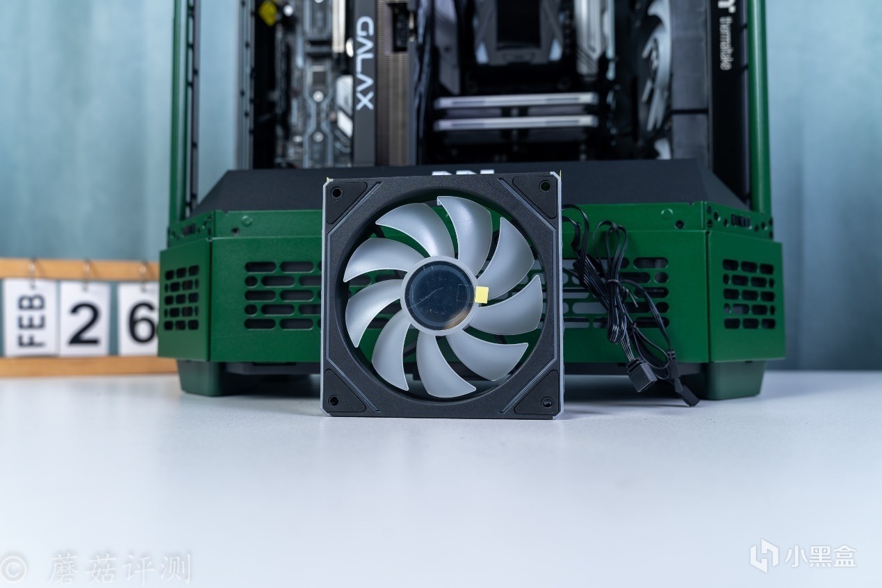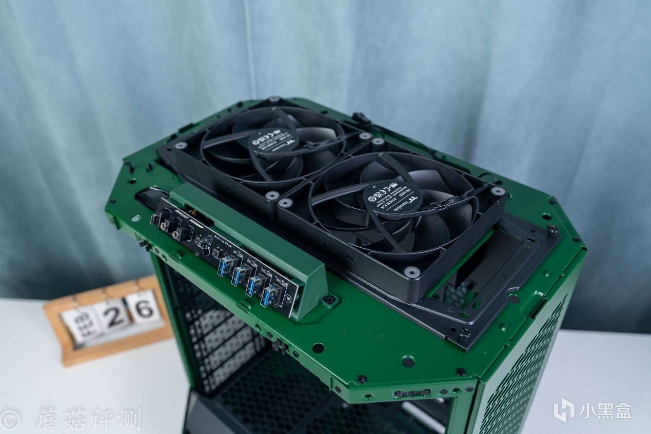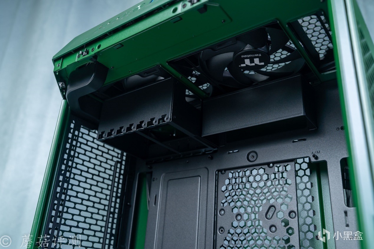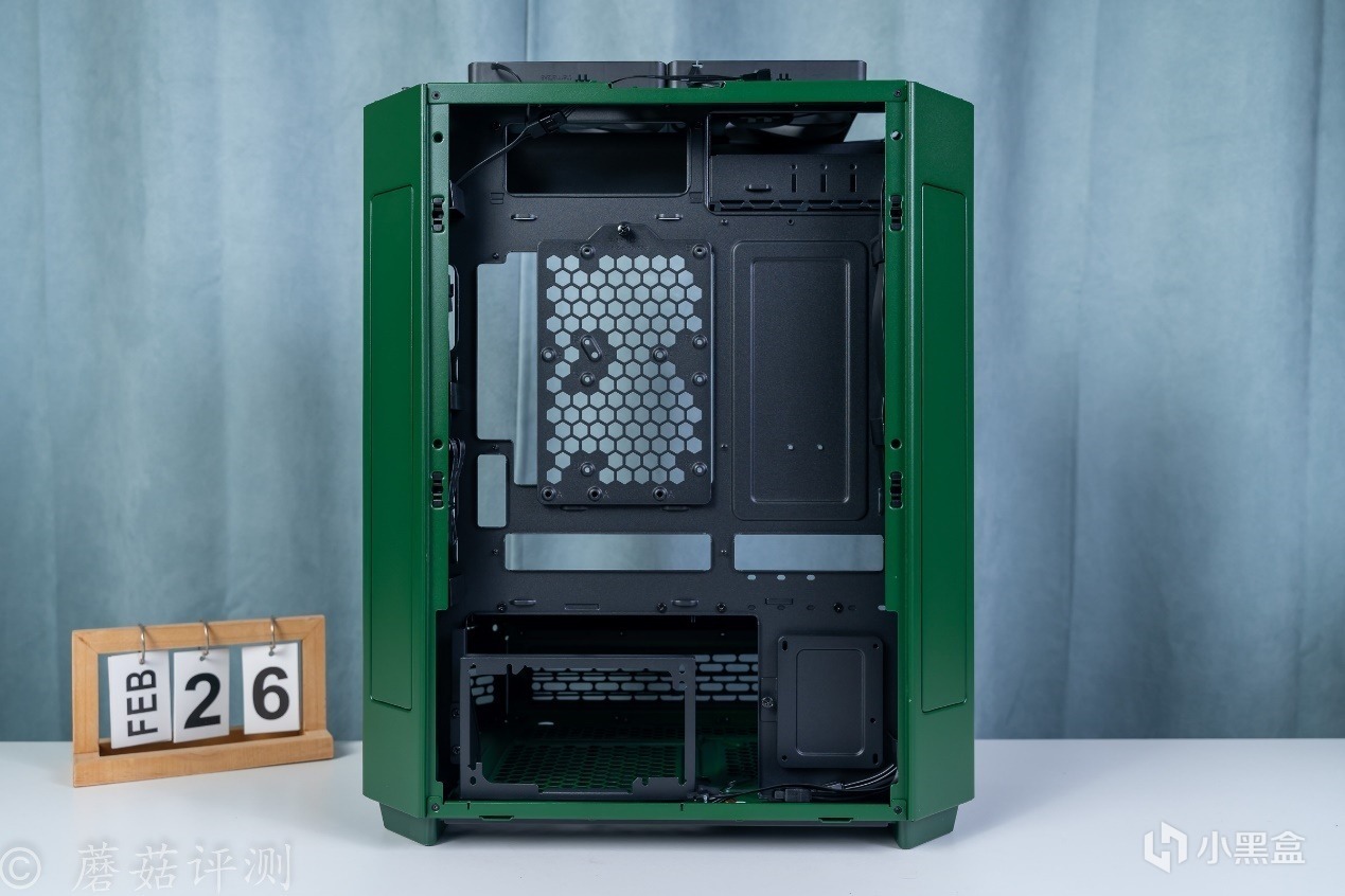 ▼机箱风扇安装在左侧,排风设计,蘑菇想让机箱从底部统一进风。