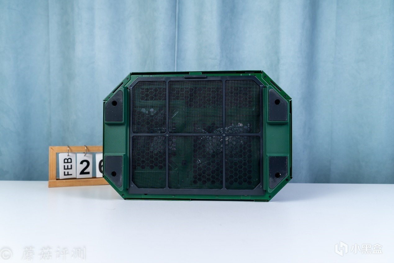 ▼另一侧是底座,四角有四个硕大的防滑橡胶垫,中间是支持快拆的防尘网。在搭配机箱支架使用的时候,需要把这一侧的底座盖板拆掉,换成和机箱顶部盖板相同的款式。