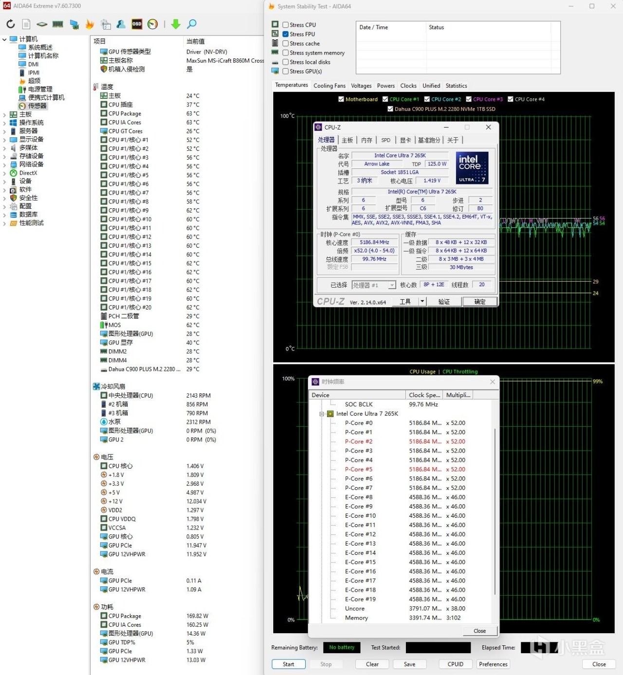 ▼简单跑个CPU-Z的压力测试,处理器功耗在170W左右,P核睿频5.2GHz,E核睿频4.6GHz,温度在63℃左右,南桥29℃,供电62℃,显卡核心28℃,固态29℃。