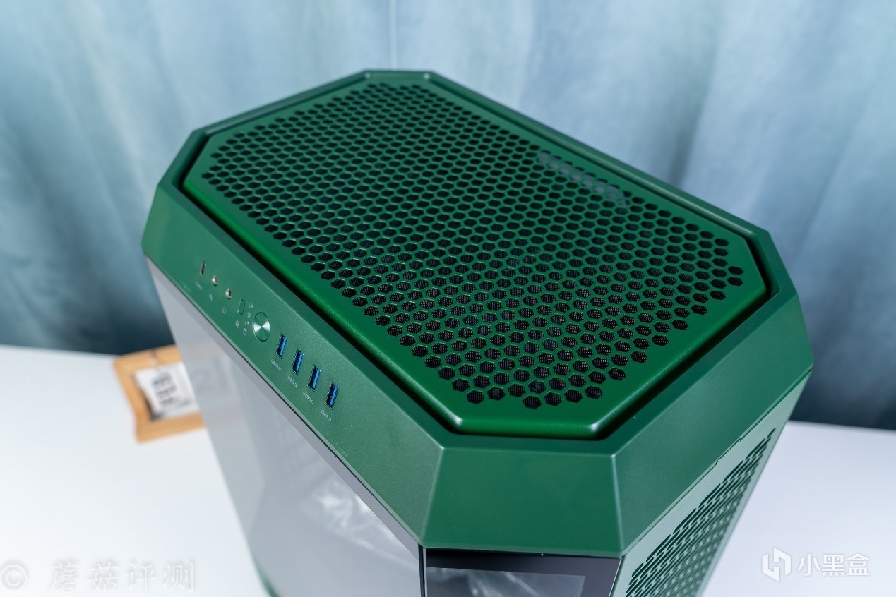 ▼机箱顶部,八边形的造型,中间是金属格栅,内部标配防尘网。