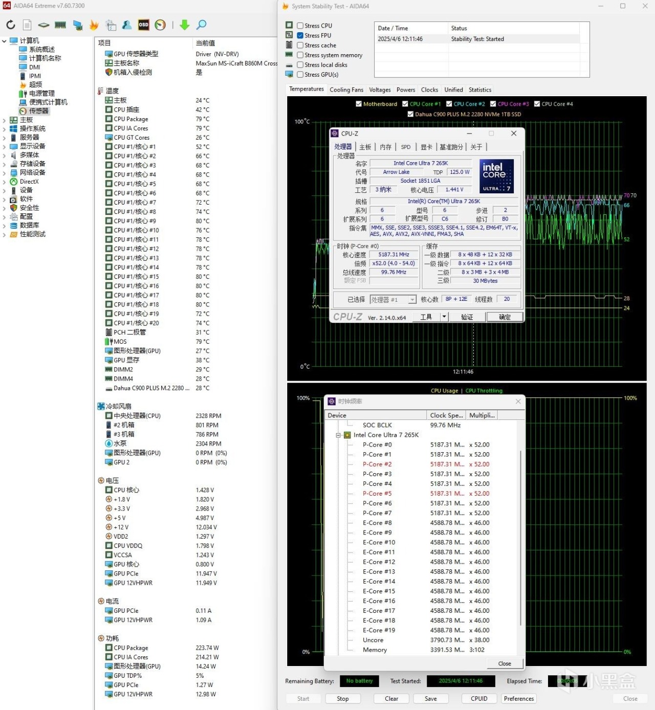▼单烤FPU测试,处理器功耗在230W左右,P核睿频5.2GHz,E核睿频4.6GHz,温度在79℃左右,南桥31℃,供电79℃,显卡核心27℃,固态28℃。整体的散热情况表现不错,处理器温度升高,冷排风扇转速提高,显卡核心温度、固态硬盘温度都会有明显下降,机箱内部风道表现不错。