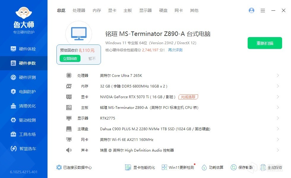 ▼整机配置一览,处理器是265K,主板是铭瑄的终结者Z890-A,显卡是影驰的RTX5070 Ti金属大师黑金OC版,整机配置很高了。