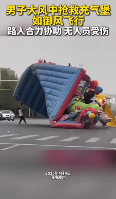 近日,河南鄭州一遊園的充氣堡被大風颳到馬路上,附近路人合力協助控制,所幸未造成人員傷亡。