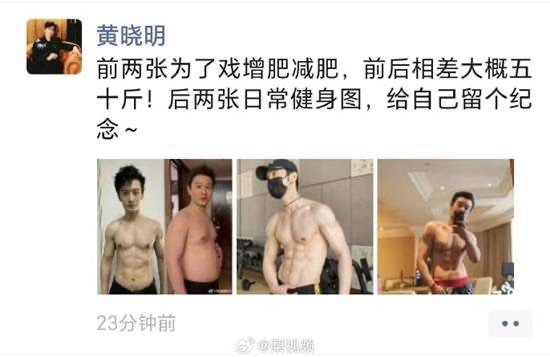 4月10日,黃曉明在朋友圈曬出自己的肌肉照,並配文:“前兩張爲了戲增肥減肥,前後相差大概五十斤!後兩張日常健身圖,給自己留個紀念~”