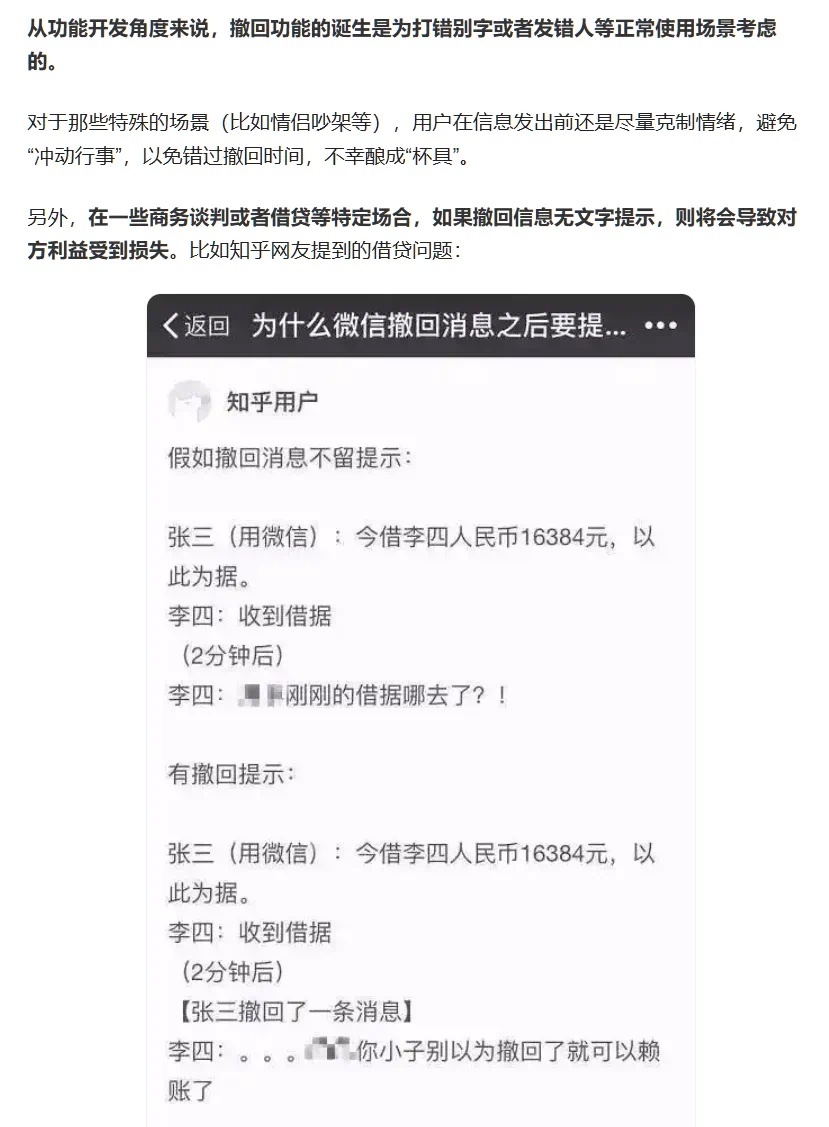 還比較有特點的是撤回消息提醒的功能,很多人覺得爲啥撤回了還要提醒啥的,這不是多此一舉嗎?但實際上微信想的是需要留痕,不能讓用戶收到信息手機亮屏了,結果啥也沒有。