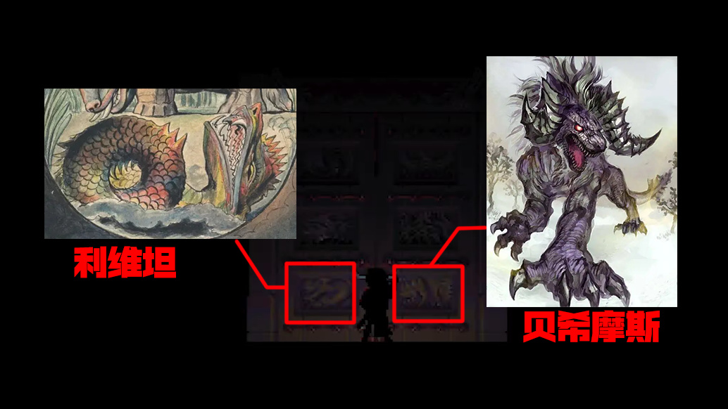 仔细观察门两边的纹路雕刻————上面有疑似凸起雕刻的“怪兽”,左边的怪兽呈蛇形,而右边呈四足动物形。与之相对应的,它们与武士零中提及的“利维坦”与“贝希摩斯”完全吻合。