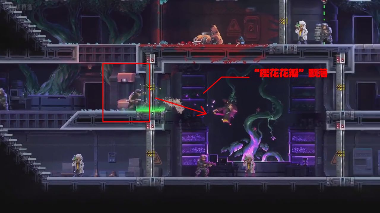 随后零号拿到了一个疑似“徽章”的道具,在一个特效过后,全屏变紫,零号开始斩杀。我们仔细观察不难发现,零号拿到道具后,他的身上开始飘散白雪同款(?)“樱花花瓣”,之后的全屏变紫,敌人身上出现一层紫色特效。但关于这新能力的效果,我们很难看出个所以然来,但关于新道具之后的全屏变紫效果,其实在以前的正常游戏流程,零号在“柯罗诺斯”的预见时间即将耗尽时,游戏屏幕也会出现紫色滤镜效果,且反复闪烁。但我敢肯定,其实这个新道具与心理医生注射的药剂毫无关系……倒是零号后面的巨大花苞与一层层保存”植物样本“倒是挺有意思,说明这些植物的成分与“某种药剂”挺有联系。