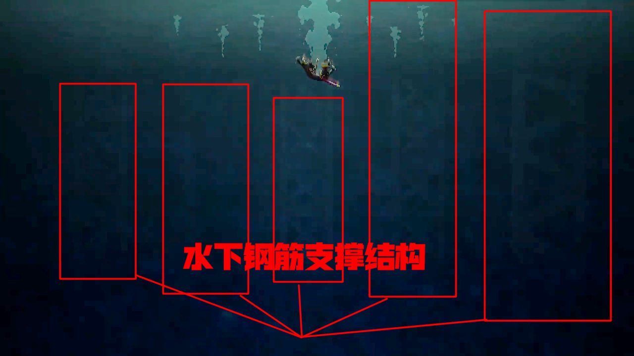 但我们不妨先冷静观察,先把亮度调大。我们会发现零号的水域周围都建上了巨大水下金属支撑结构。推测零号可能在游戏中提及的【新麦加净水厂】之中,新麦加净水厂有此类结构十分合理。而在游戏流程中,电视新闻提及的新麦加净水场出场原因为“冷凝液泄漏”,如果零号费劲心思来到这里,可能说明该设施与“联界集团”脱不开关系。