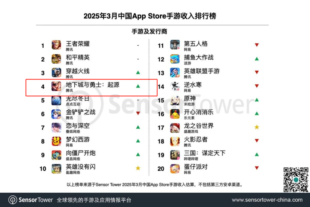 Sensor Tower统计显示,《地下城与勇士:起源》3月收入增长56%,在Top20榜单上的排名由第6位上升至第4位。