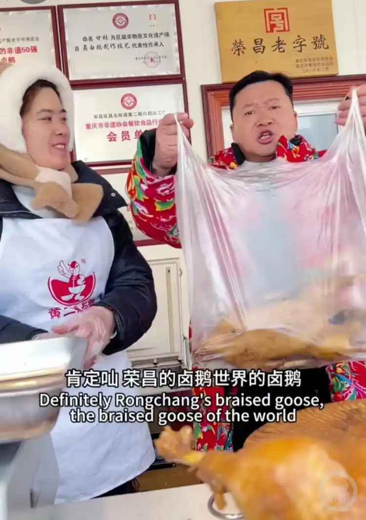 通过“甲亢哥”的全球直播,荣昌卤鹅作为非遗美食被推向国际,网友感叹“全世界都知道了荣昌卤鹅”。