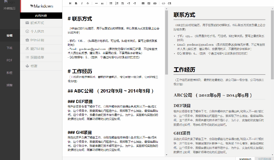 這是一個良心且好用的在線簡歷製作網站,支持Markdown編輯,小標題可以一鍵生成,你只需要按照模板來填寫自己的信息就行。
